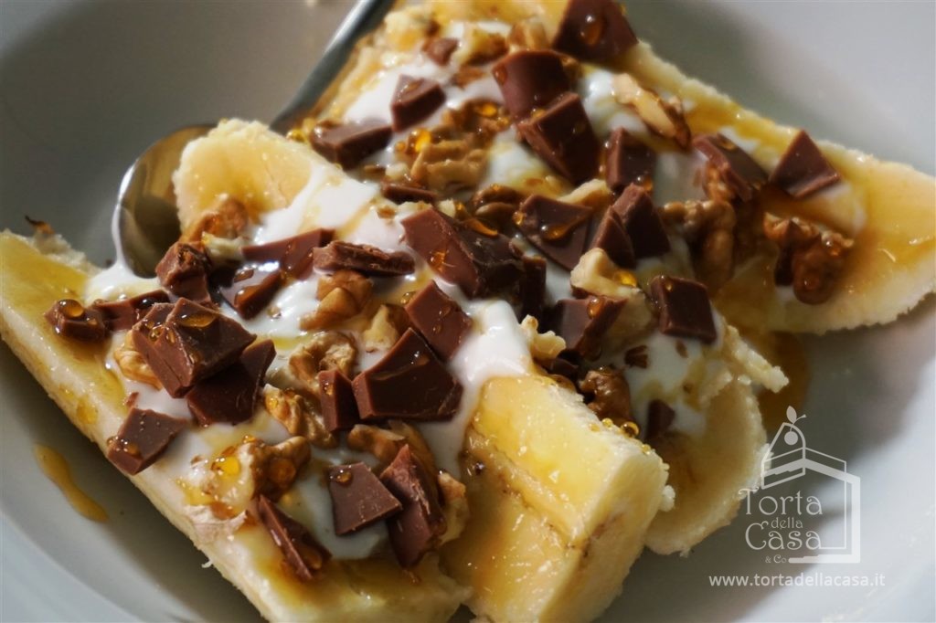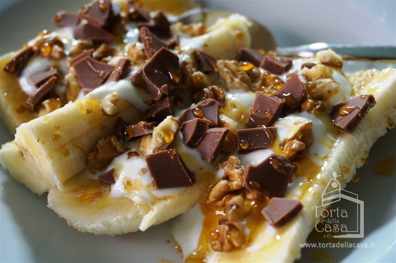 Disporre su di un piatto i pezzi di banana e versare sopra i 4 cucchiai di yogurt bianco.