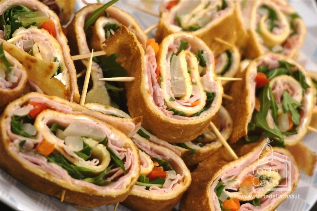 Arrotolare su se stessa la crepe farcita ed una volta completato il procedimento fermare il tutto con gli stuzzicadenti. Gli stuzzicadenti andranno posizionati a vostro gradimento, a seconda di quanto spessi volete fare gli stuzzichini.