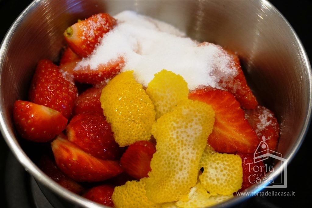 Mettere le fragole in un tegame, cuocere a fuoco basso con la scorza, il succo del limone e lo zucchero semolato per circa 10 minuti a coperchio semi chiuso.