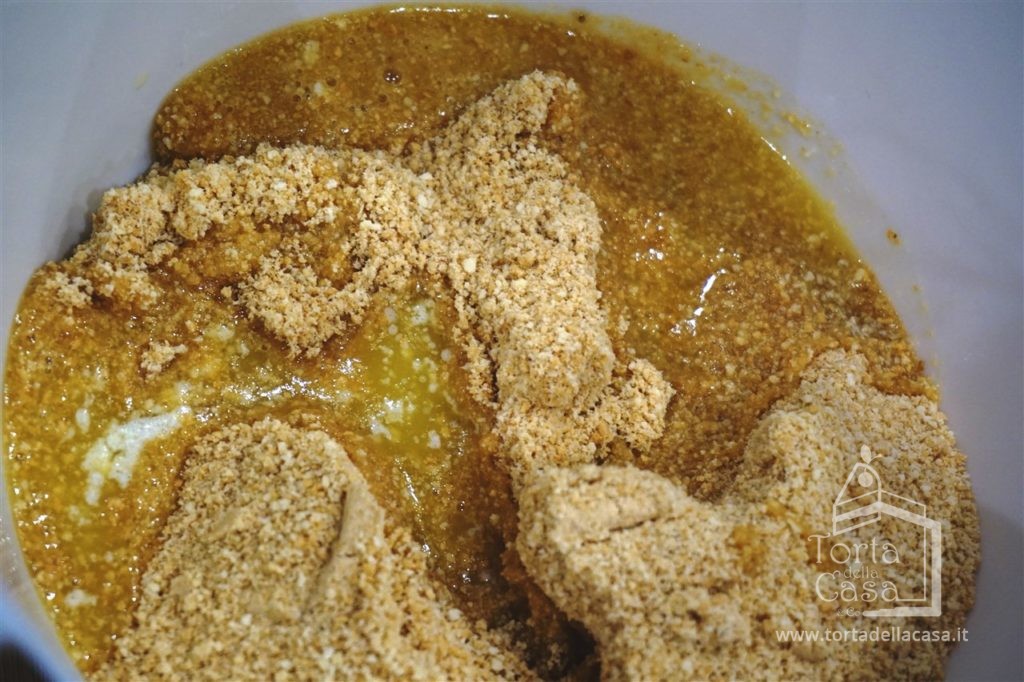 Con un mixer frulliamo i biscotti ed una volta raggiunta una pezzatura fine, amalgamarli bene con il burro fuso.