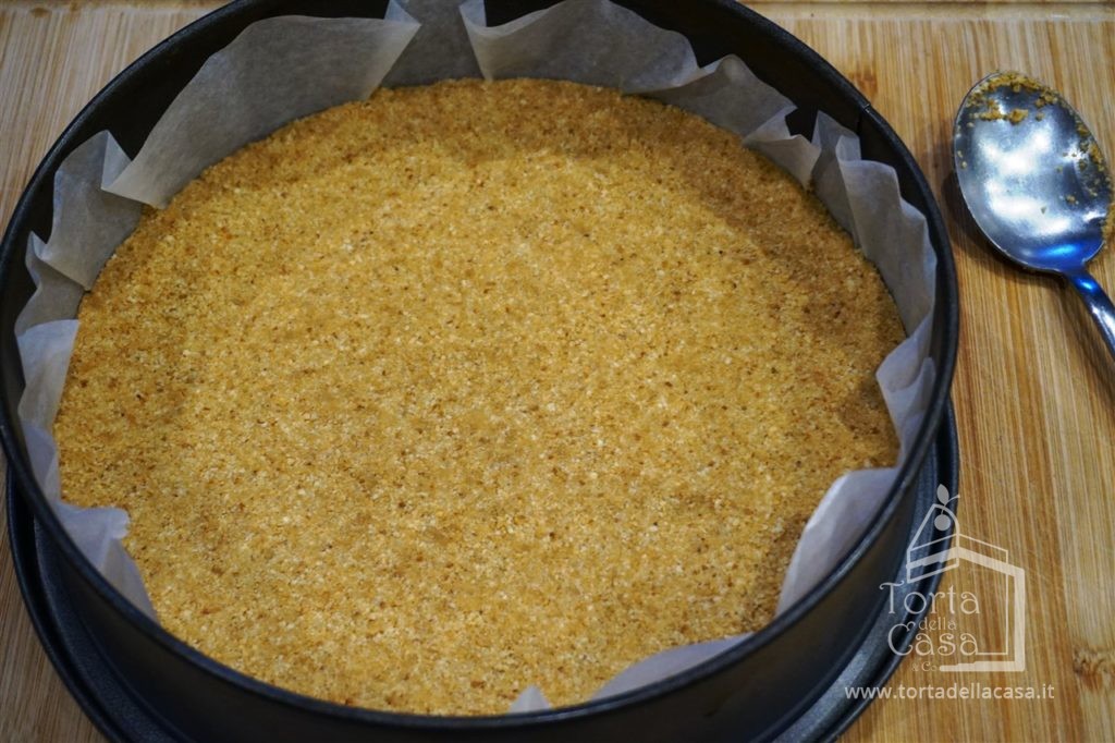 Versare il composto di biscotto nella tortiera e comprimerlo con un cucchiaio..