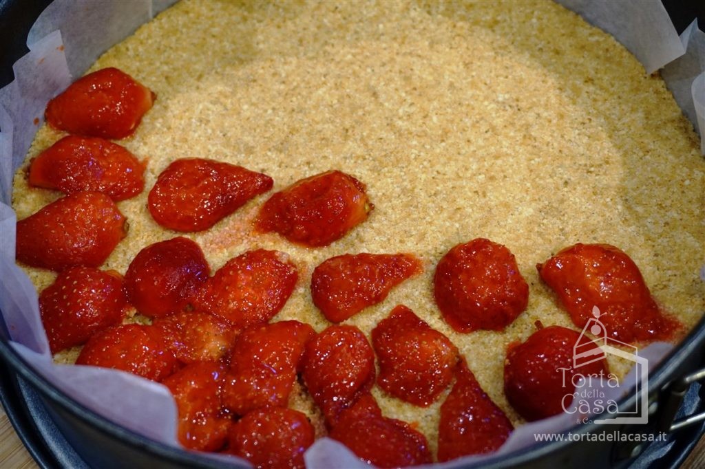 Quando sarà ben compatto, disporre sulla superficie le fragole cotte private dello sciroppo e lasciare riposare in frigorifero.