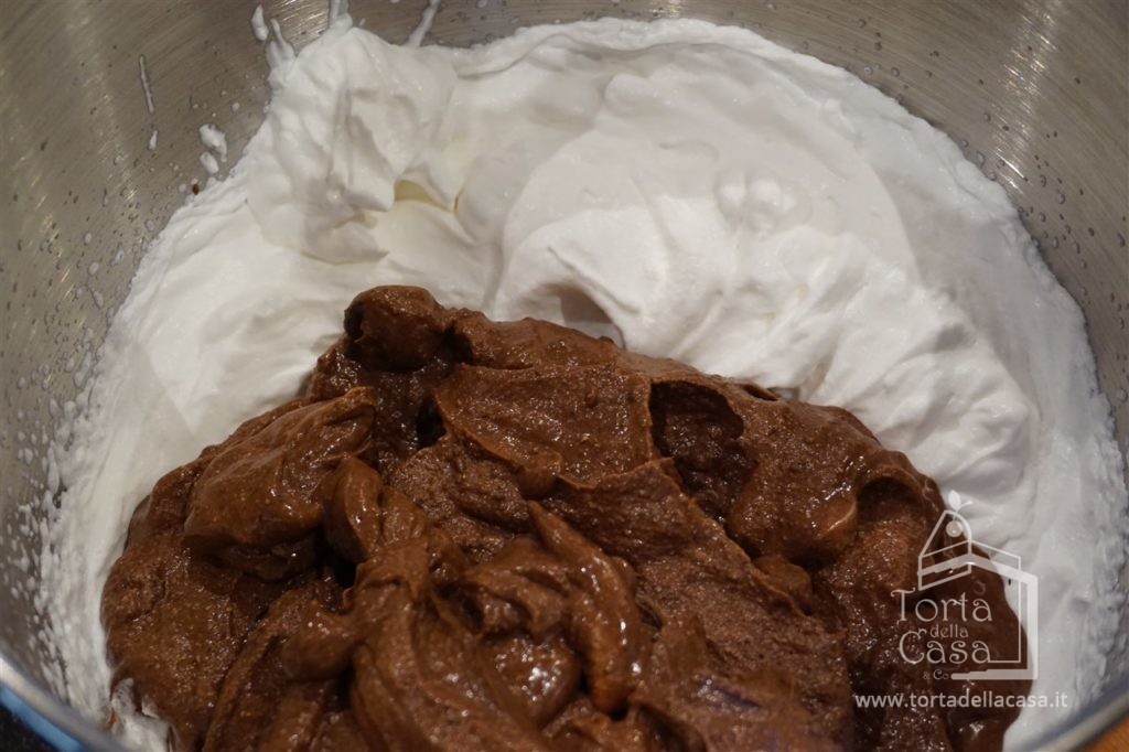 Aggiungiamo il composto di cioccolato alla panna montata e lavoriamo 30 secondi con le fruste elettriche.