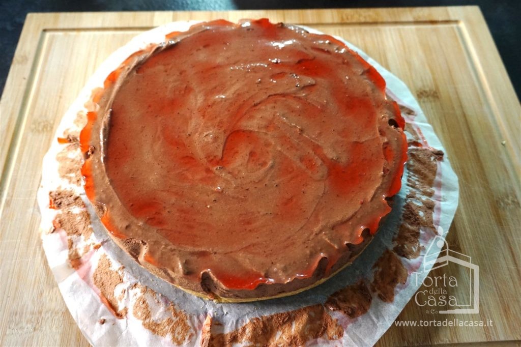 In una ciotola versiamo la cremina di ricotta, 200 gr di gelatina di succo di fragole (la rimanente servirà per la copertura della torta), il cioccolato fuso ed il cacao amaro in polvere. Mescoliamo con una spatola fino ad ottenere una crema dal colore uniforme.