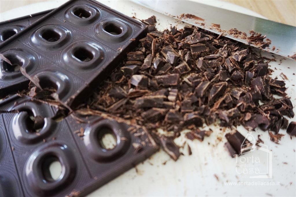 Tritare in maniera grossolana il cioccolato fondente.