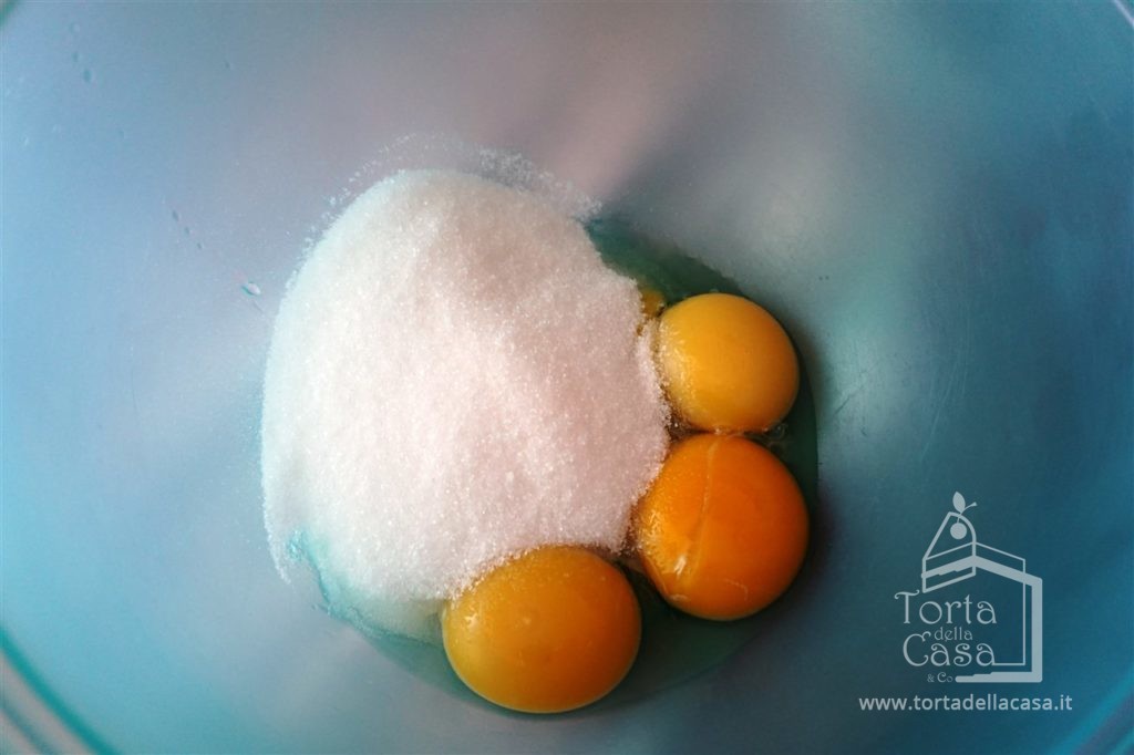 Disporre in un recipiente i tuorli e lo zucchero e montare con lo sbattitore elettrico alla massima velocità fino ad ottenere un composto chiaro e spumoso. Io non utilizzo anche gli albumi dell’uovo perché, per il mio gusto, rendono il mascarpone troppo liquido. Eventualmente se gradiste una consistenza non troppo solida, potete utilizzare 2 uova intere più due tuorli.