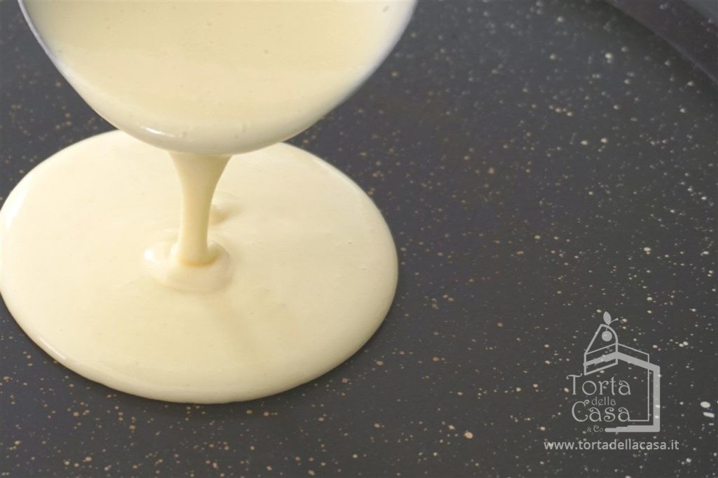 Quando la teglia sarà giunta in temperatura (solitamente impiega almeno 5 minuti) utilizzare un mestolo per versare il composto sulla teglia e velocemente procedere a stendere il composto liquido con movimenti circolari in modo da dare la giusta forma e spessore alla crepe.