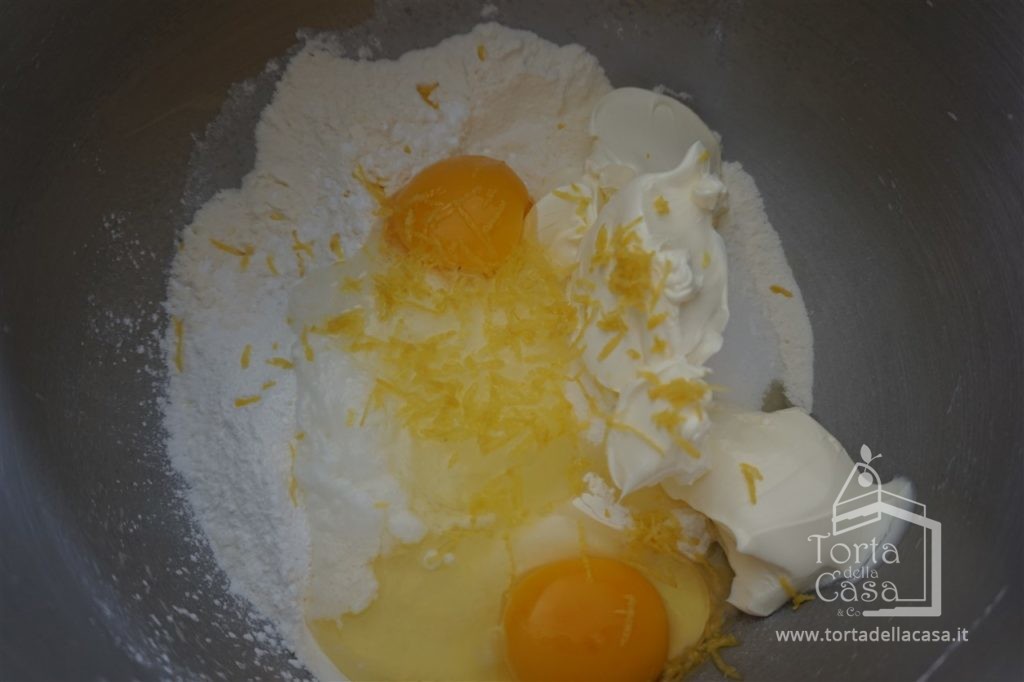 Mettere farina, yogurt, zucchero, uova, olio di semi di girasole, ½ bustina di lievito e scorza di arancia in una ciotola e lavorarli con una forchetta.