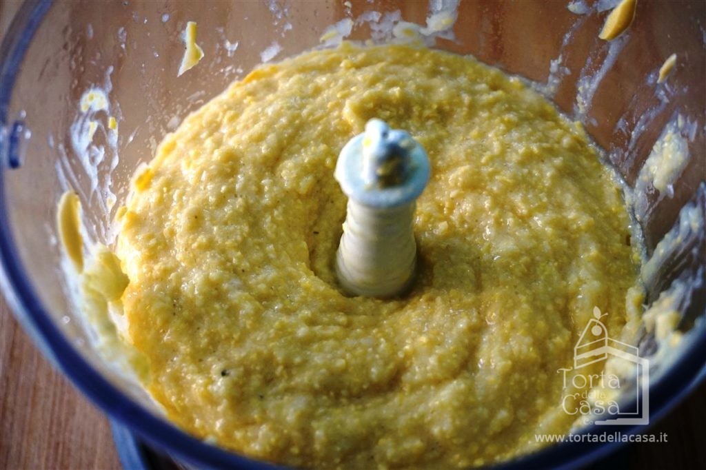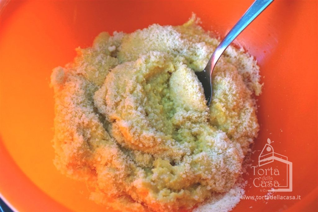 In un recipiente versiamo il composto ottenuto e vi aggiungiamo 5 cucchiai di farina di mais e 4 cucchiai di grana padano grattugiato. La consistenza che otterremo mescolando sarà morbida e appiccicosa, va bene cosi!