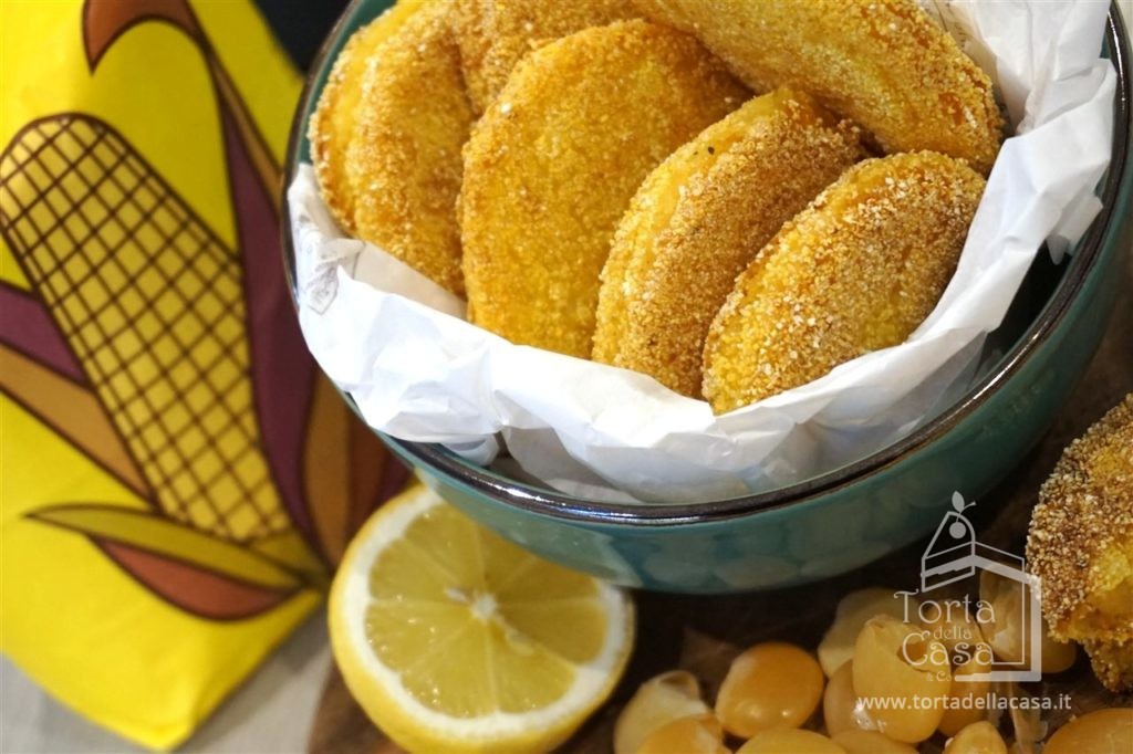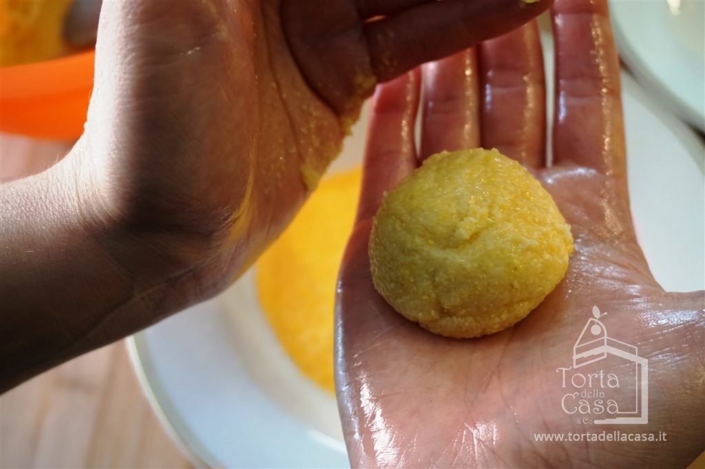 Mettete la pallina nel piatto con la farina di mais, cospargerla bene di farina toccandola molto delicatamente e quando sarà ben infarinata, premetela in superficie aiutandovi con il cucchiaio. Procedete cosi fino al termine del composto.