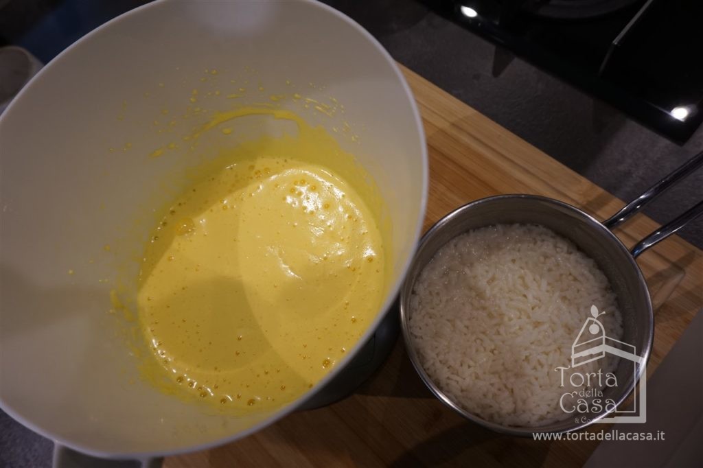 Versare il riso nel composto spumoso e mescolare con una spatola.