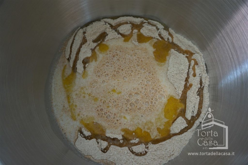 Aggiungere il liquido di acqua e latte tiepidi e l’olio extravergine d’oliva.
