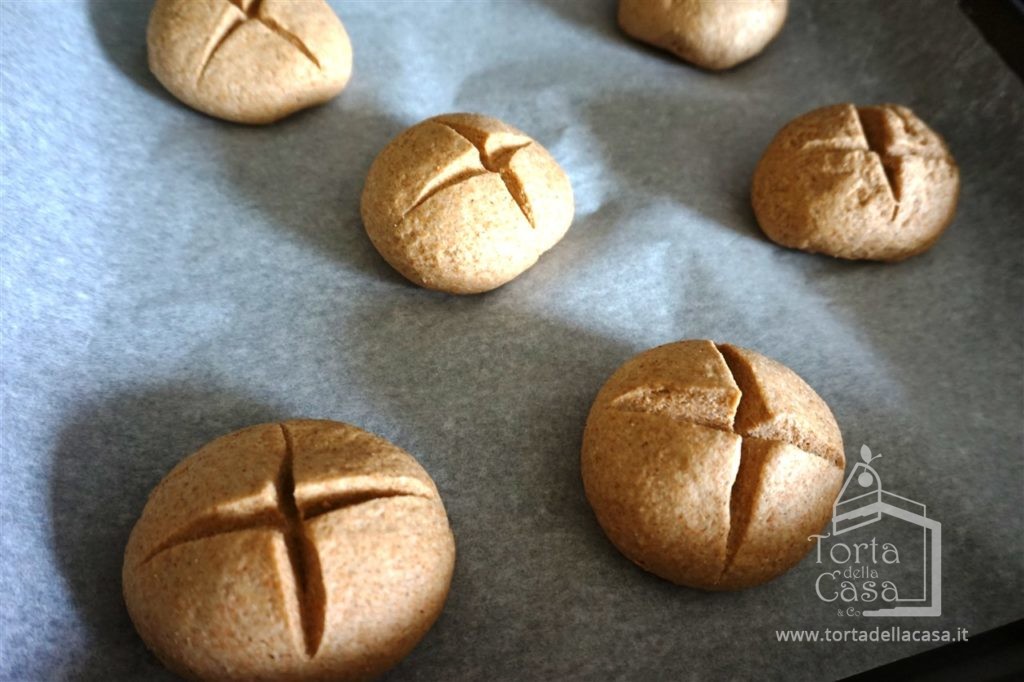 Trascorso questo tempo, dividere l’impasto in 6 panetti più o meno di dimensione simile (altrimenti la cottura non sarà uniforme), impastarli dandogli la forma desiderata, praticare su ogni pallina un taglio a croce e metterli a lievitare ben distanziati su una teglia ricoperta con carta da forno per almeno 3 ore.