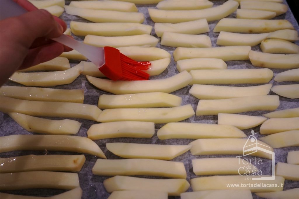 Preparare una teglia ricoprendola con della carta da forno, sopra disponete i listelli di patate senza sovrapporli e successivamente spennellarli con dell’olio di semi di girasole. Se non avete il pennello, potete mettere le patate tagliate in una ciotola e versare sopra un pò di olio di semi di girasole e rigirarle con le mani fino a che non saranno unte in maniera uniforme.