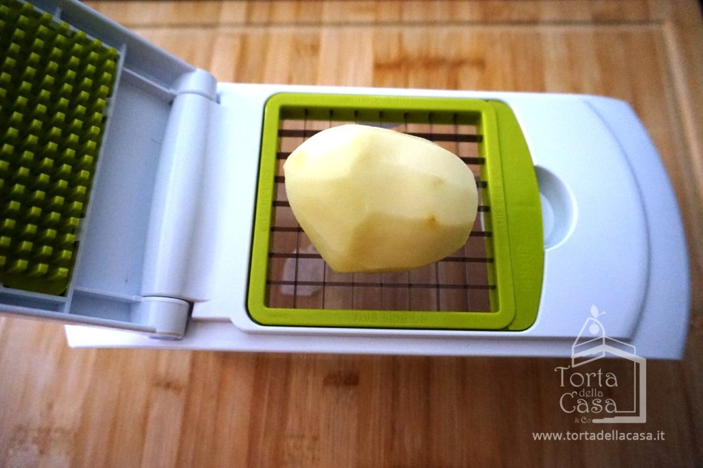 Procedere con il tagliarle le patate a listelli più o meno della stessa dimensione ed una volta terminato, lavarli ed asciugarli. Io per il taglio, utilizzo un attrezzo manuale che le taglia in maniera uniforme.