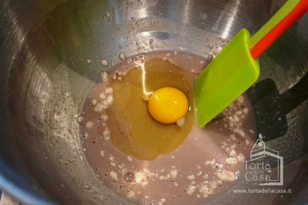 Al liquido di latte e lievito, aggiungere zucchero, vino sangiovese, uovo, burro fuso (oppure olio di semi di girasole) e mescolare con una spatola o una frusta a mano.
