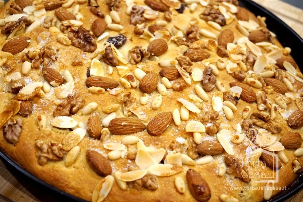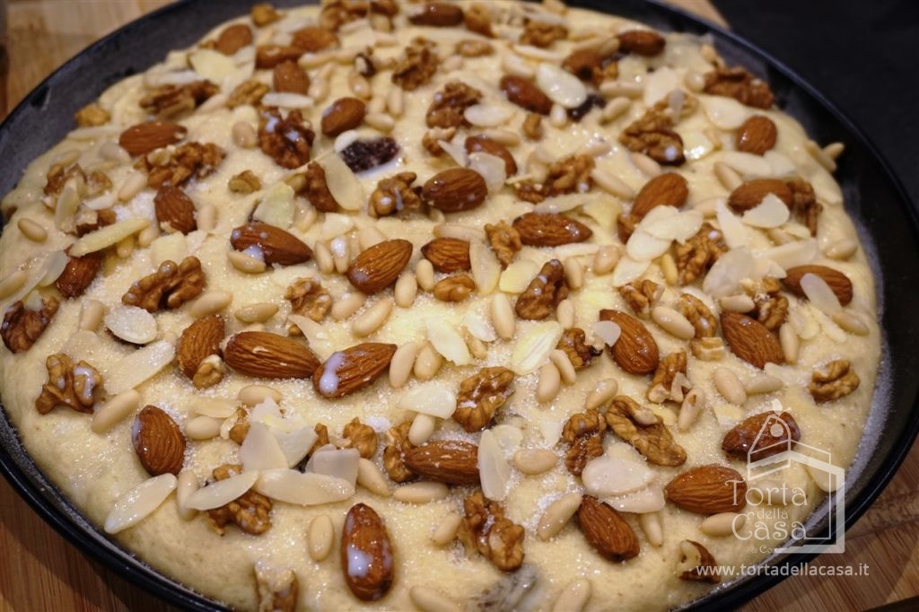 Spianarlo con le mani fino ai bordi della tortiera e cospargere la superficie con pinoli, mandorle e gherigli di noce a vostro piacere.