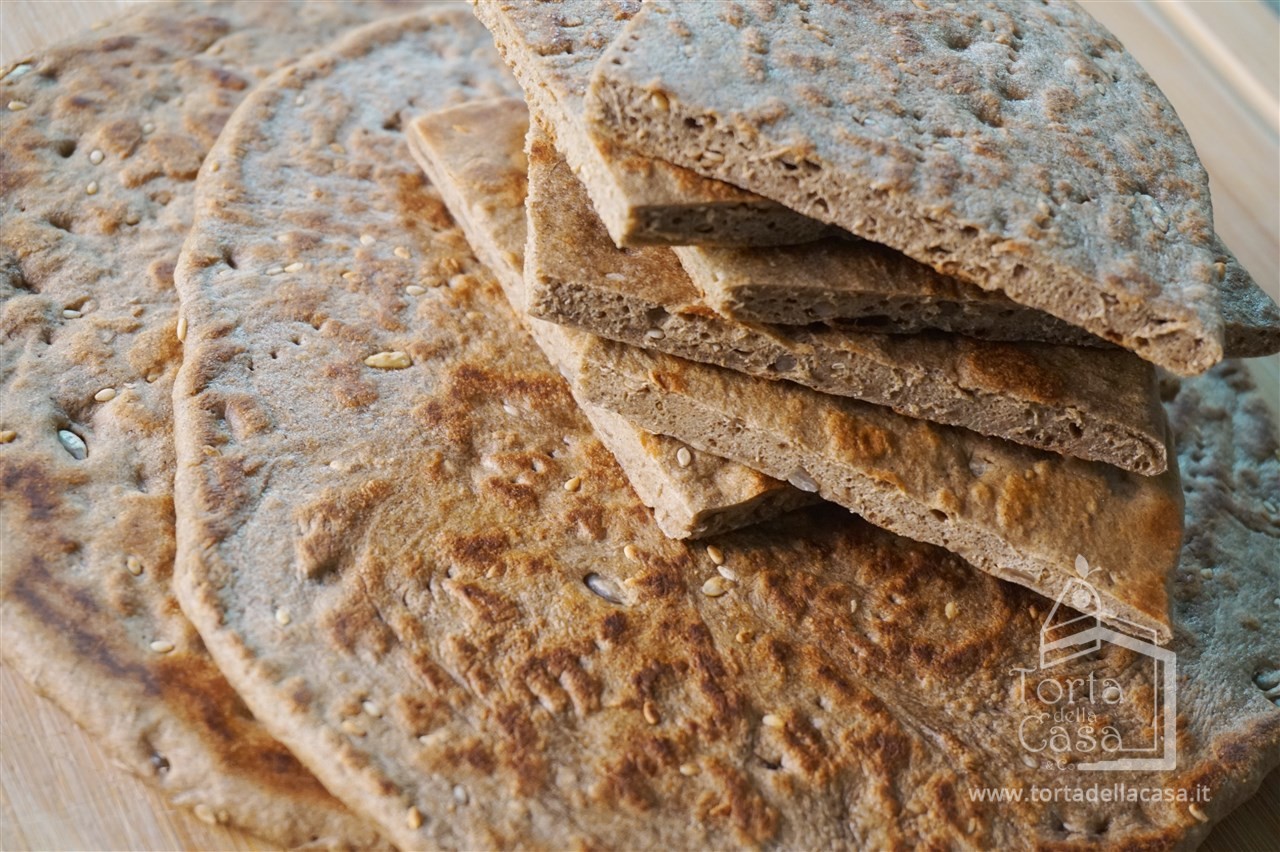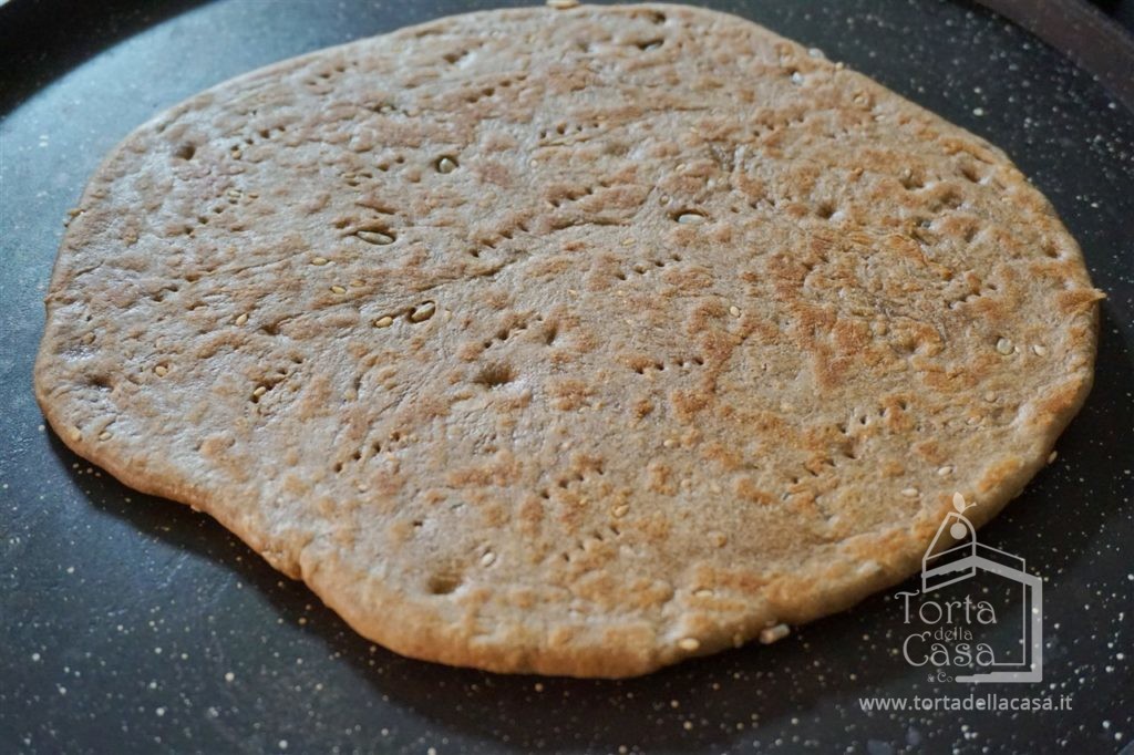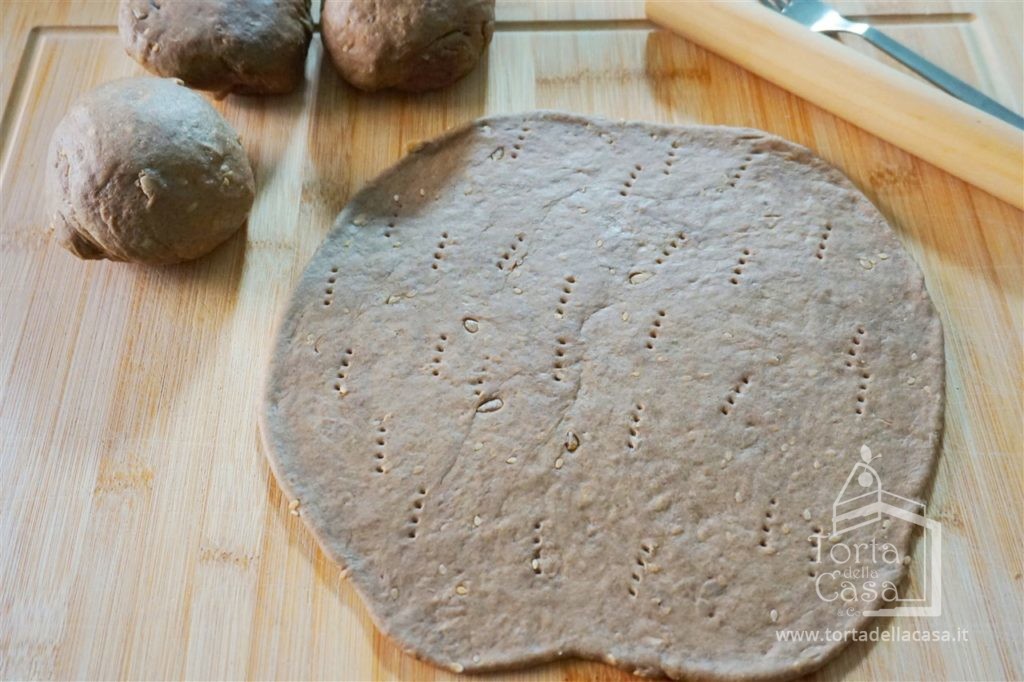 Stendere con il mattarello ciascuna pallina di impasto fino ad arrivare ad uno spessore di circa 5 mm, bucherellarne la superficie con una forchetta e cuocere sulla teglia ben calda.