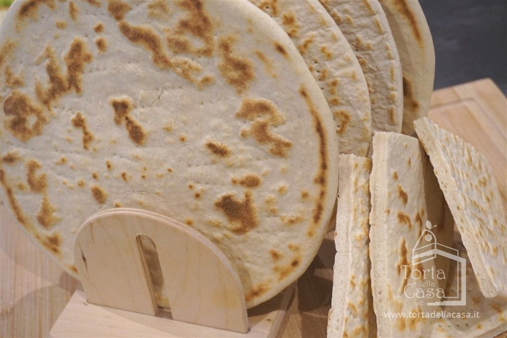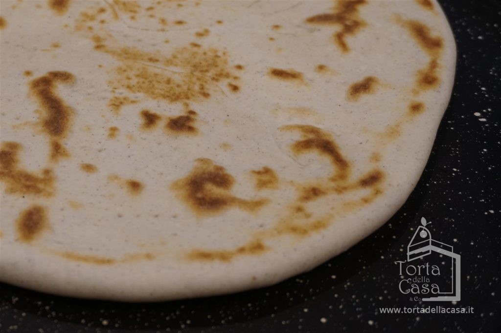 Stendere con il mattarello ciascuna pallina di impasto fino ad arrivare ad uno spessore di circa 5 mm, bucherellarne la superficie con una forchetta e cuocere sulla teglia ben calda.