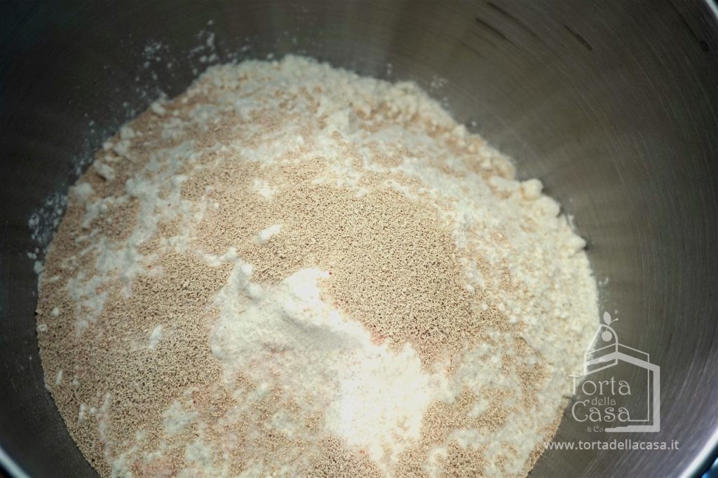In un recipiente disporre farina, bustina di lievito di birra secco, zucchero e pizzico di sale. Mescolare con una forchetta.