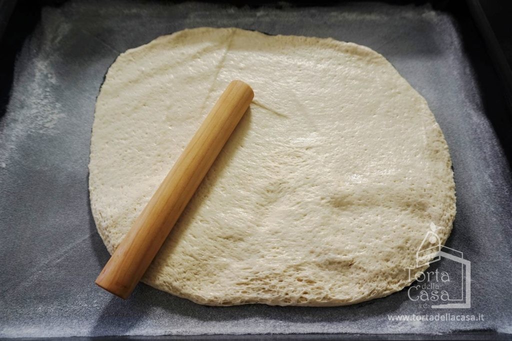 Trascorso questo tempo, versate ciascun impasto lievitato in 2 teglie precedentemente unte ed infarinate. Stendetelo con le mani o con un mattarello fino ad arrivare ai bordi.