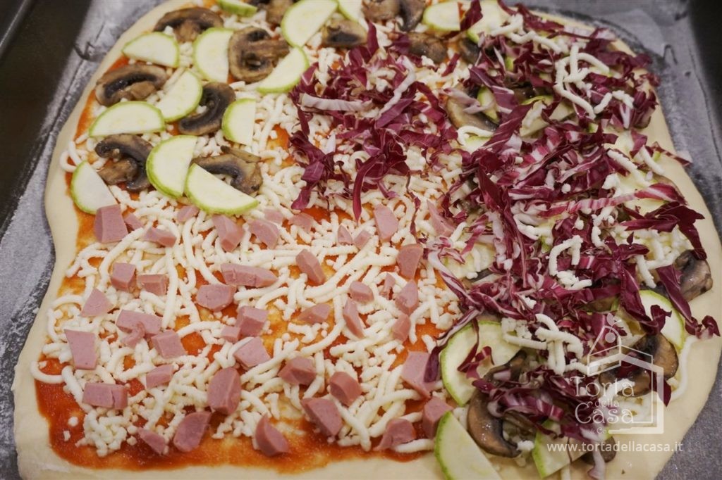 Nel frattempo che il forno raggiunge la temperatura procediamo con il farcire a piacere le pizze.