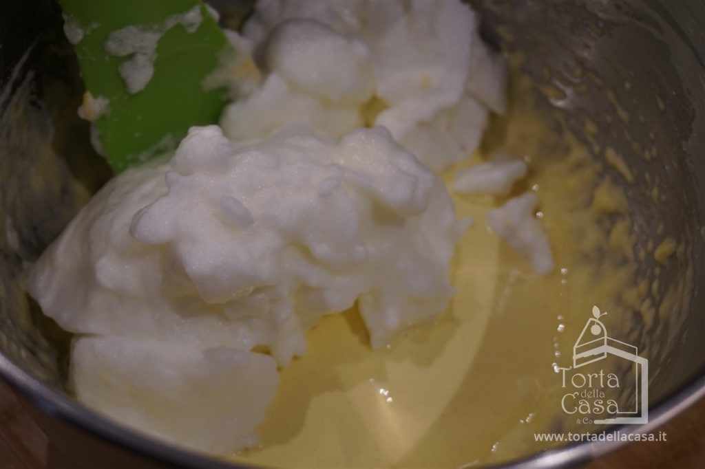 Ora con la spatola, incorporiamo gli albumi nella ciotola dei tuorli montati con lo zucchero. Lavoreremo il composto con movimenti dal basso verso l’alto fino all’assorbimento degli albumi.
