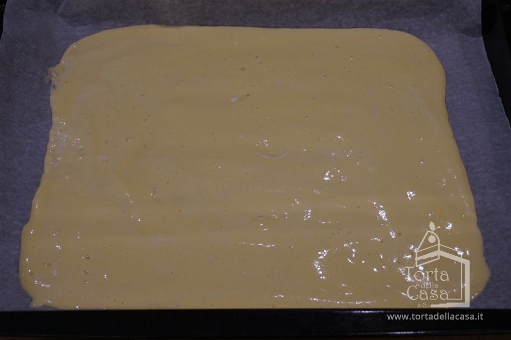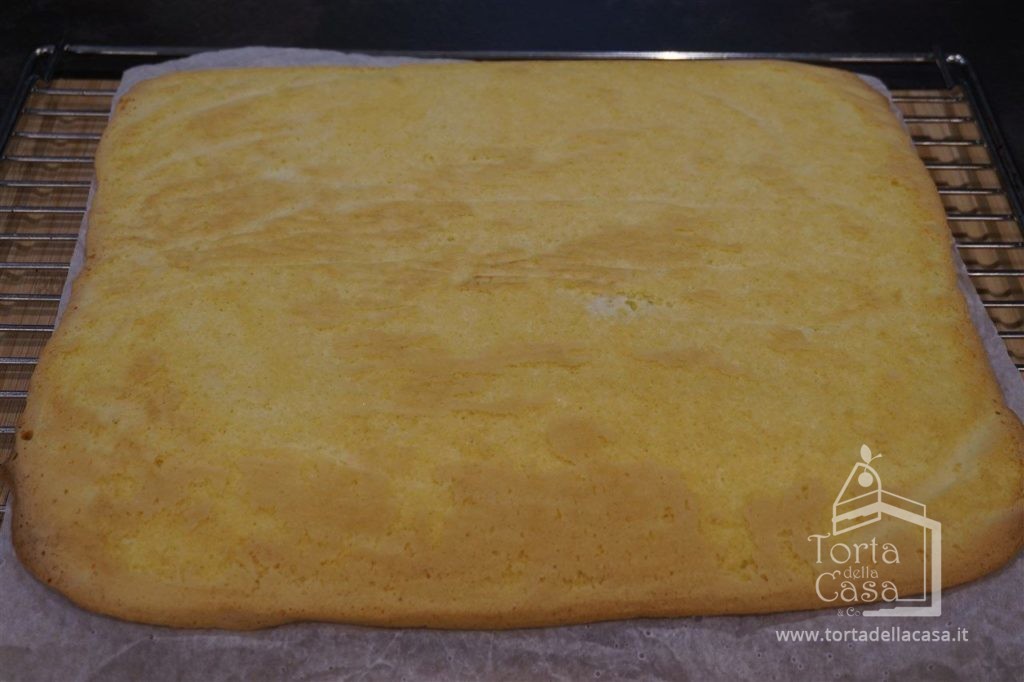 A cottura ultimata, stendere sul vostro piano di lavoro un foglio di carta da forno anch’esso bagnato e strizzato per bene, vi capovolgiamo con attenzione l’impasto cotto e cerchiamo di togliere molto dolcemente la carta da forno utilizzata in cottura.