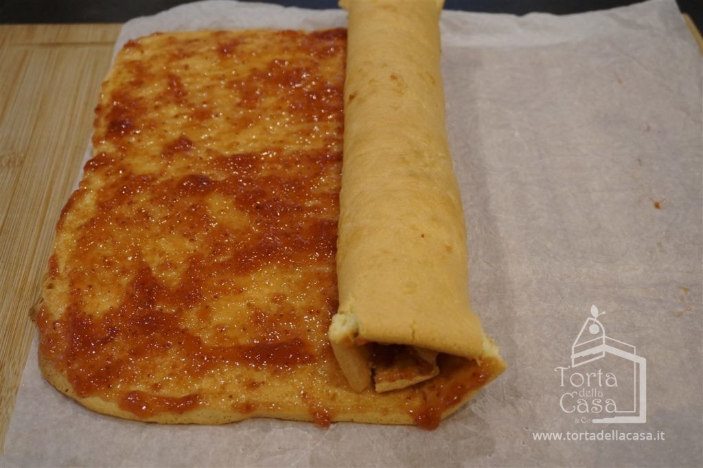 Con un cucchiaio stendere la marmellata di ciliegie sopra l’impasto e, sempre molto delicatamente, arrotolare la pasta su se stessa aiutandovi con la carta da forno in modo tale da mantenere la compattezza.