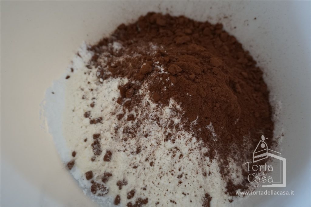 In un altro recipiente unire farina, lievito e cacao in polvere amalgamandoli uniformemente con una forchetta.