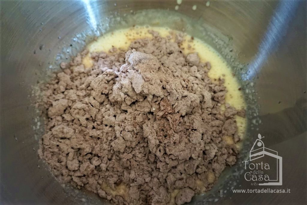 Versare il composto sbricioloso nel recipiente con le uova montate e lavorate con le fruste elettriche alla minima velocità per 1 minuto.